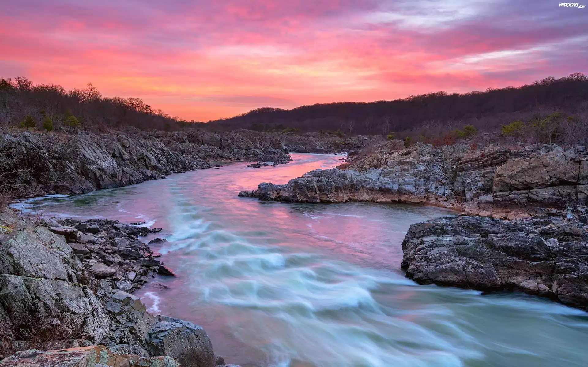 Zdjęcia, Rzeka, Skały, Zachód słońca, Drzewa