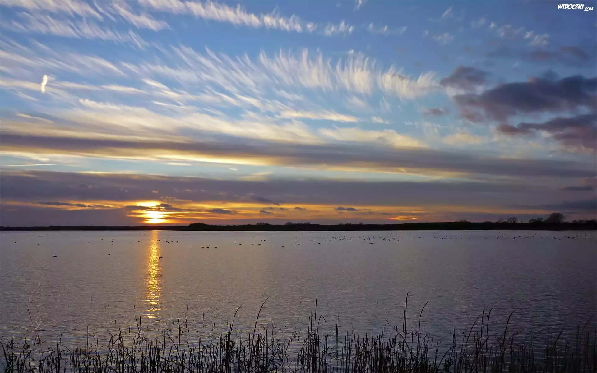 Zdjęcia, Rzeka, Trawy, Zachód, Słońca, Chmury