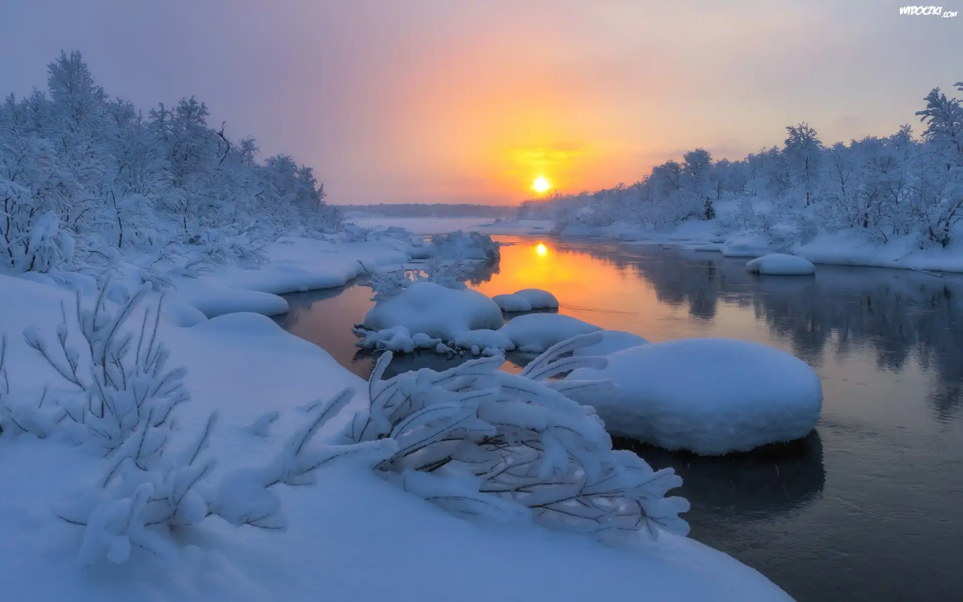 Zima, Rzeka, Kamienie, Śnieg, Drzewa, Krzaki, Wschód słońca