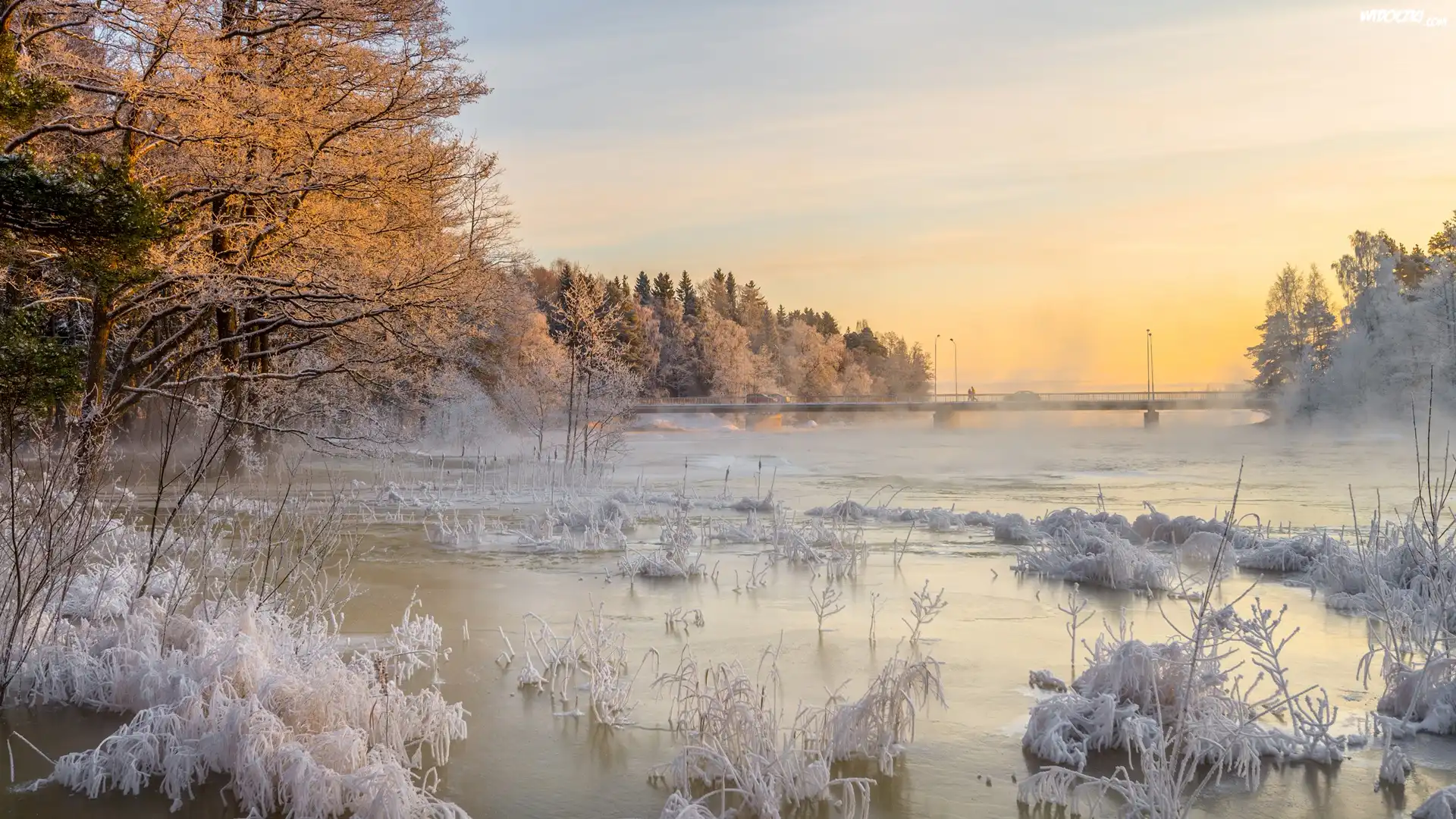 Zima, Rzeka, Most, Drzewa, Krzewy, Mgła, Wschód słońca