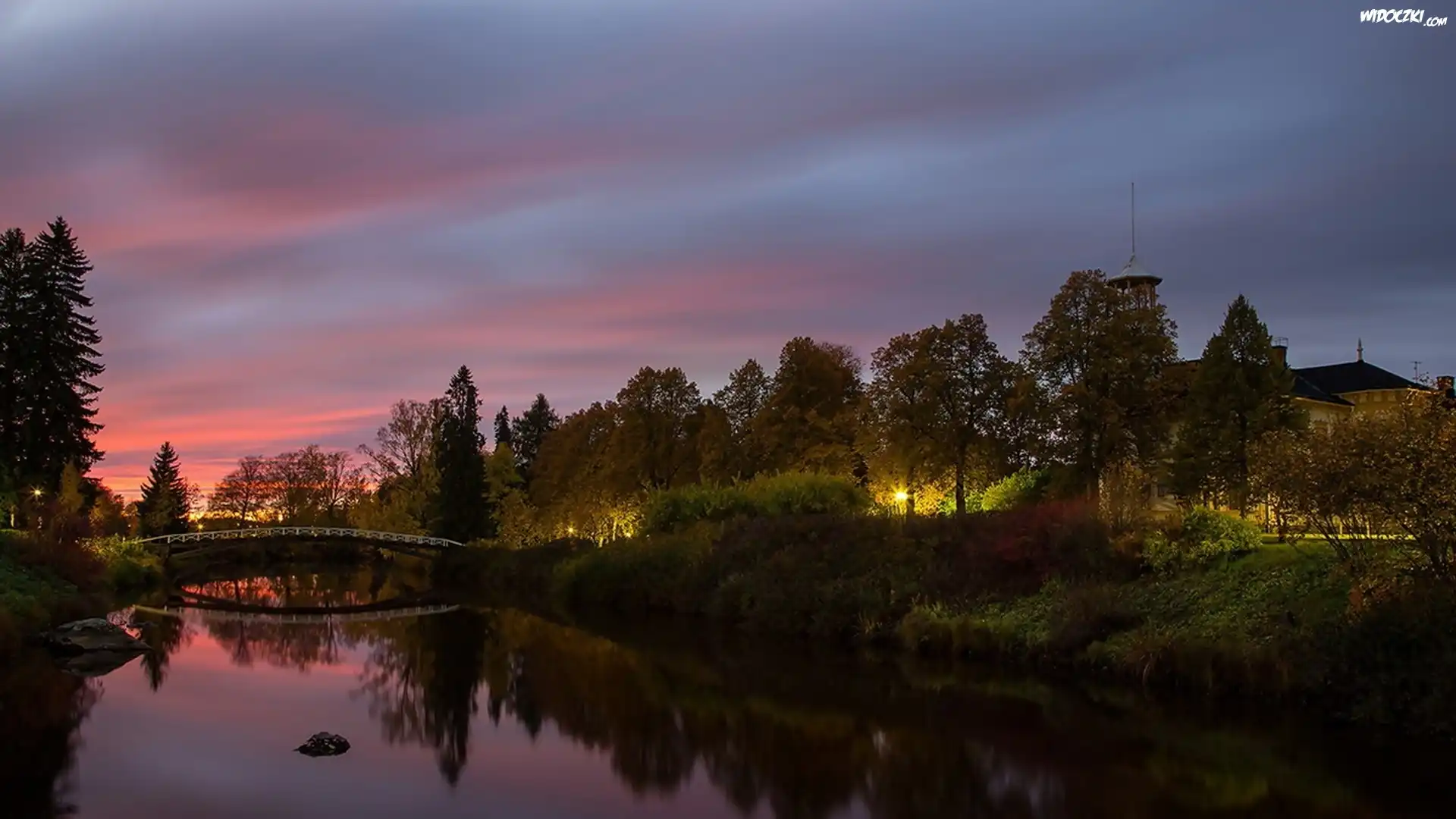 Zdjęcia, Rzeka, Most, Zachodzące, Słońce, Drzewa