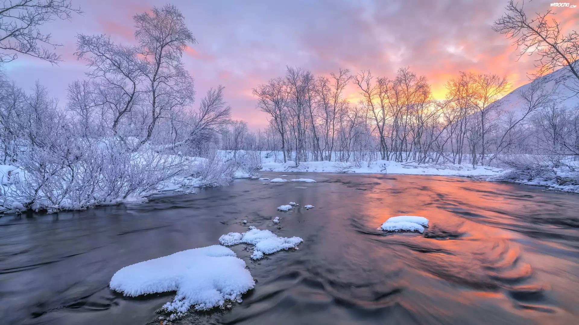 Zdjęcia, Zima, Rzeka, Śnieg, Bezlistne, Drzewa