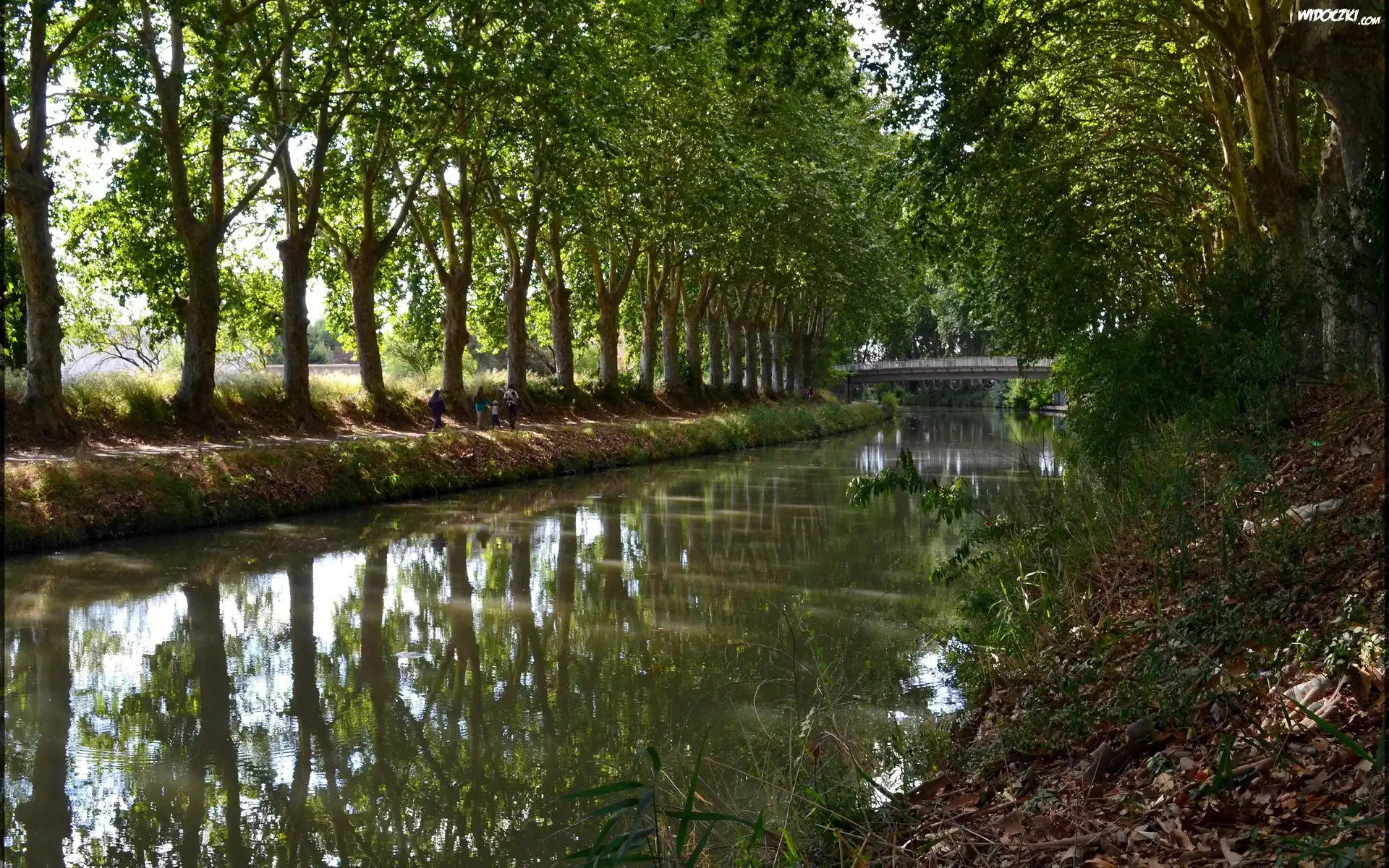 Rzeka, Drzewa, Spacerowicze, Most