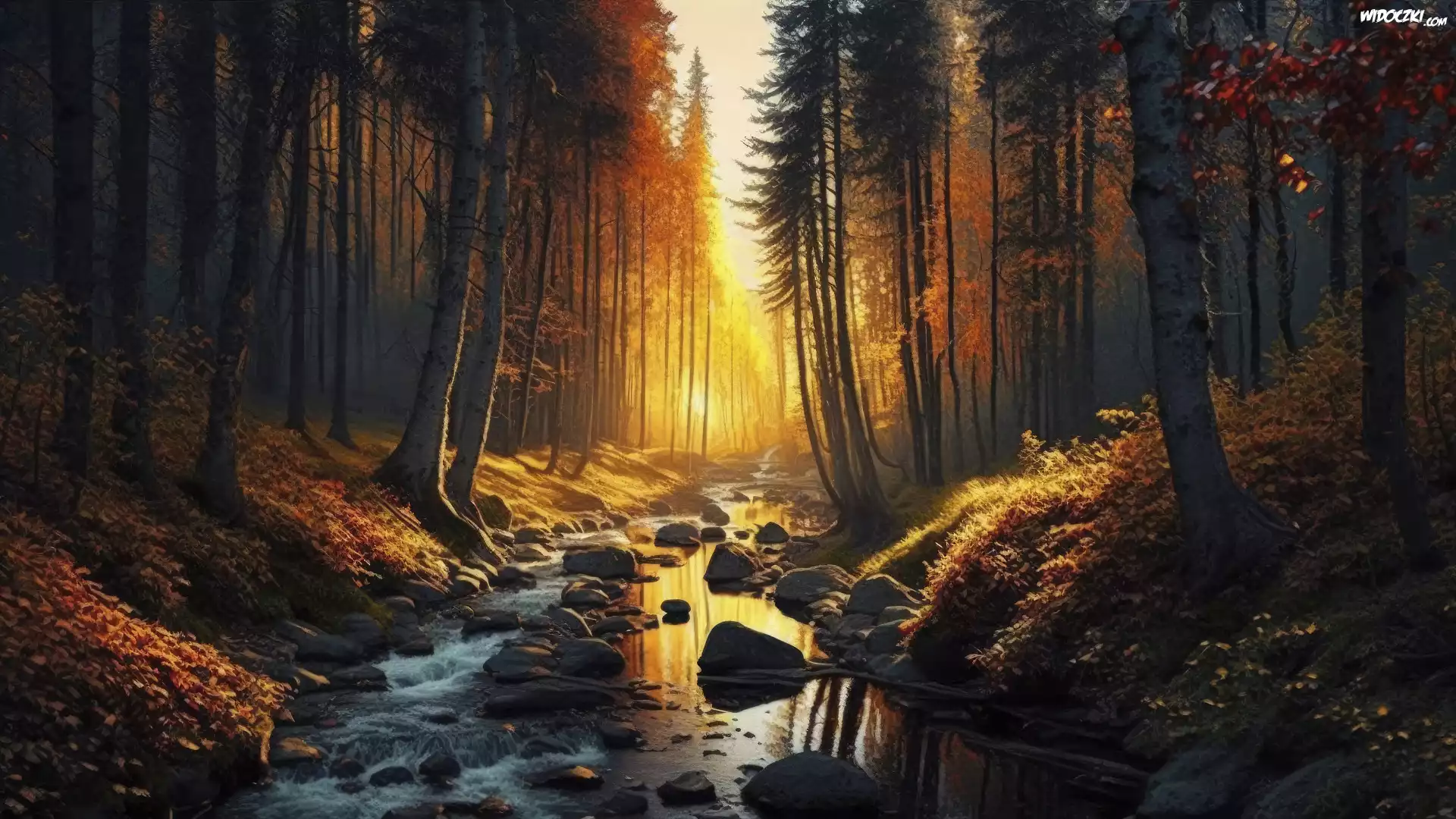 Las, Drzewa, Strumień, Rzeka, Jesień, Słoneczny, Dzień