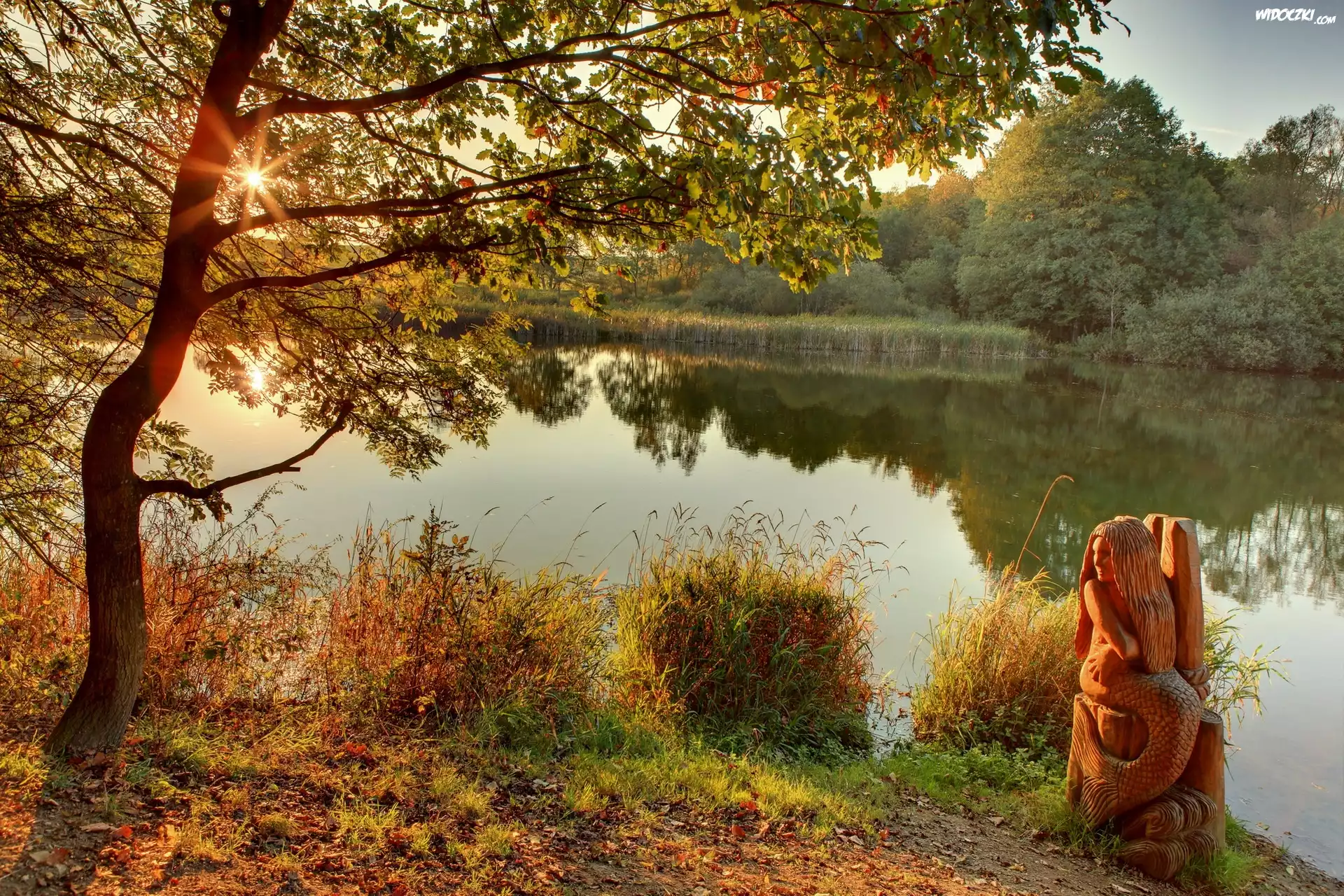 Rzeka, Promienie, Słońca, Drzewa, Syrena, Rzezba