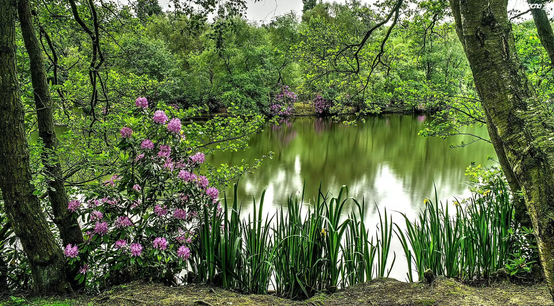 Zdjęcia, Rzeka, Drzewa, Trawa, Kwiaty