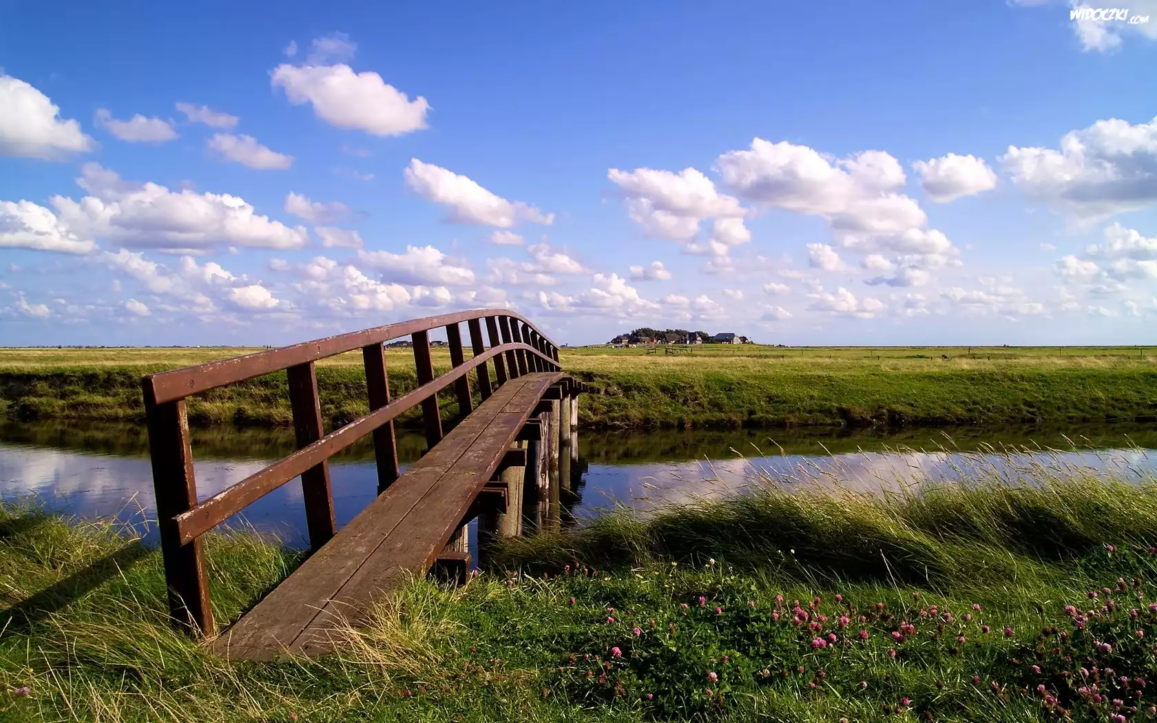 Zdjęcia, Rzeka, Kładka, Trawa, Chmury