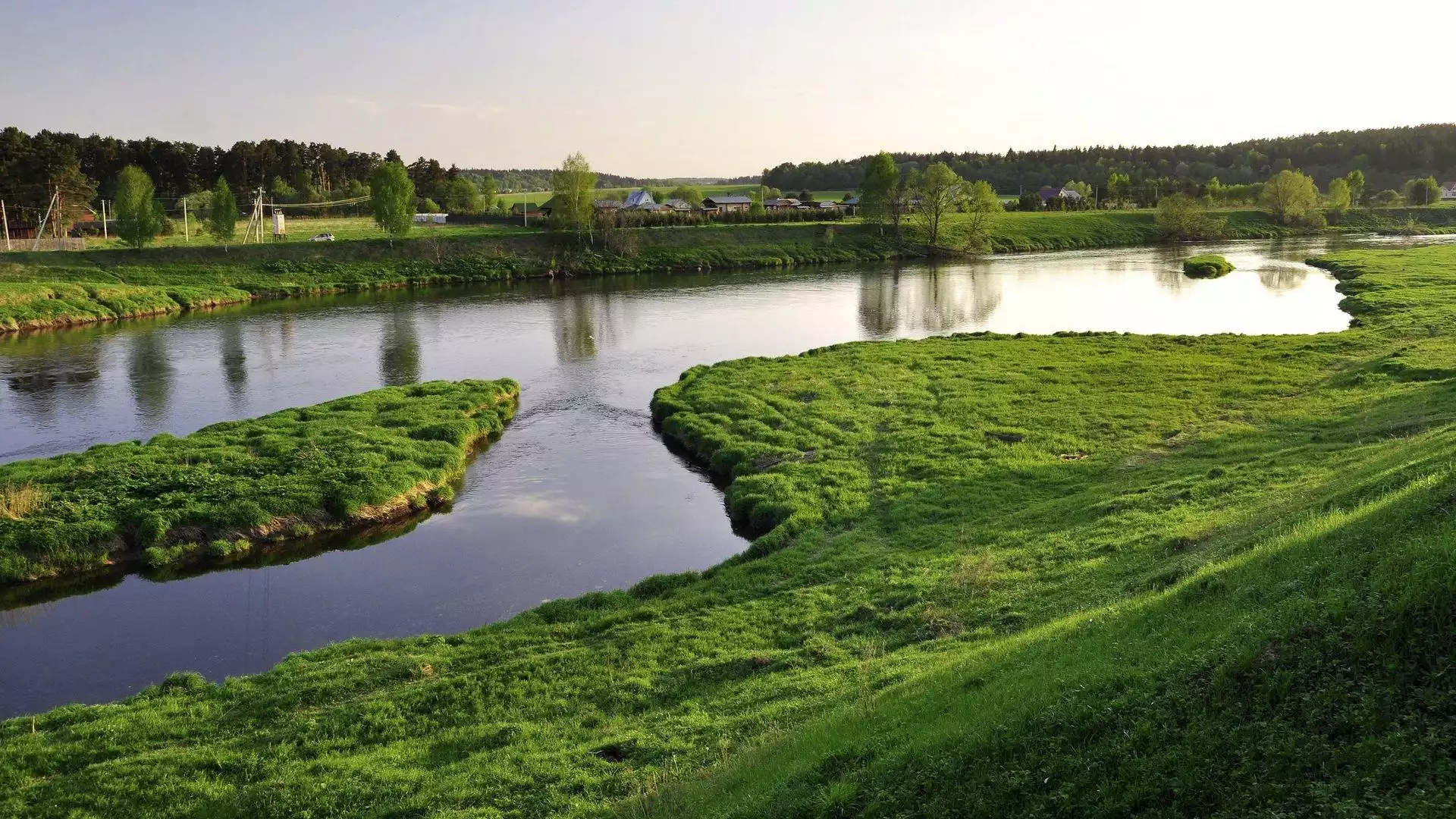 Zdj臋cia, Rzeka, Pola, Trawa, Zabudowania