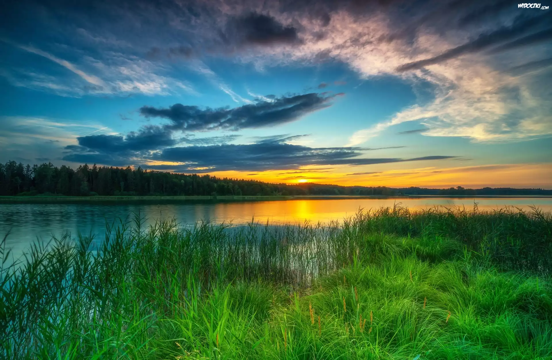 Zdjęcia, Rzeka, Zachód słońca, Trawa, Drzewa