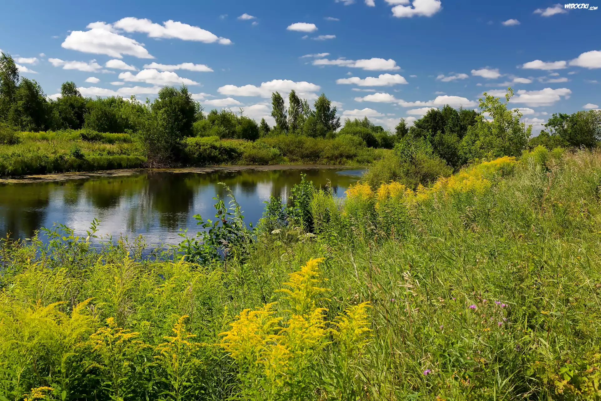 Zdjęcia, Rzeka, Łąka, Trawy, Drzewa