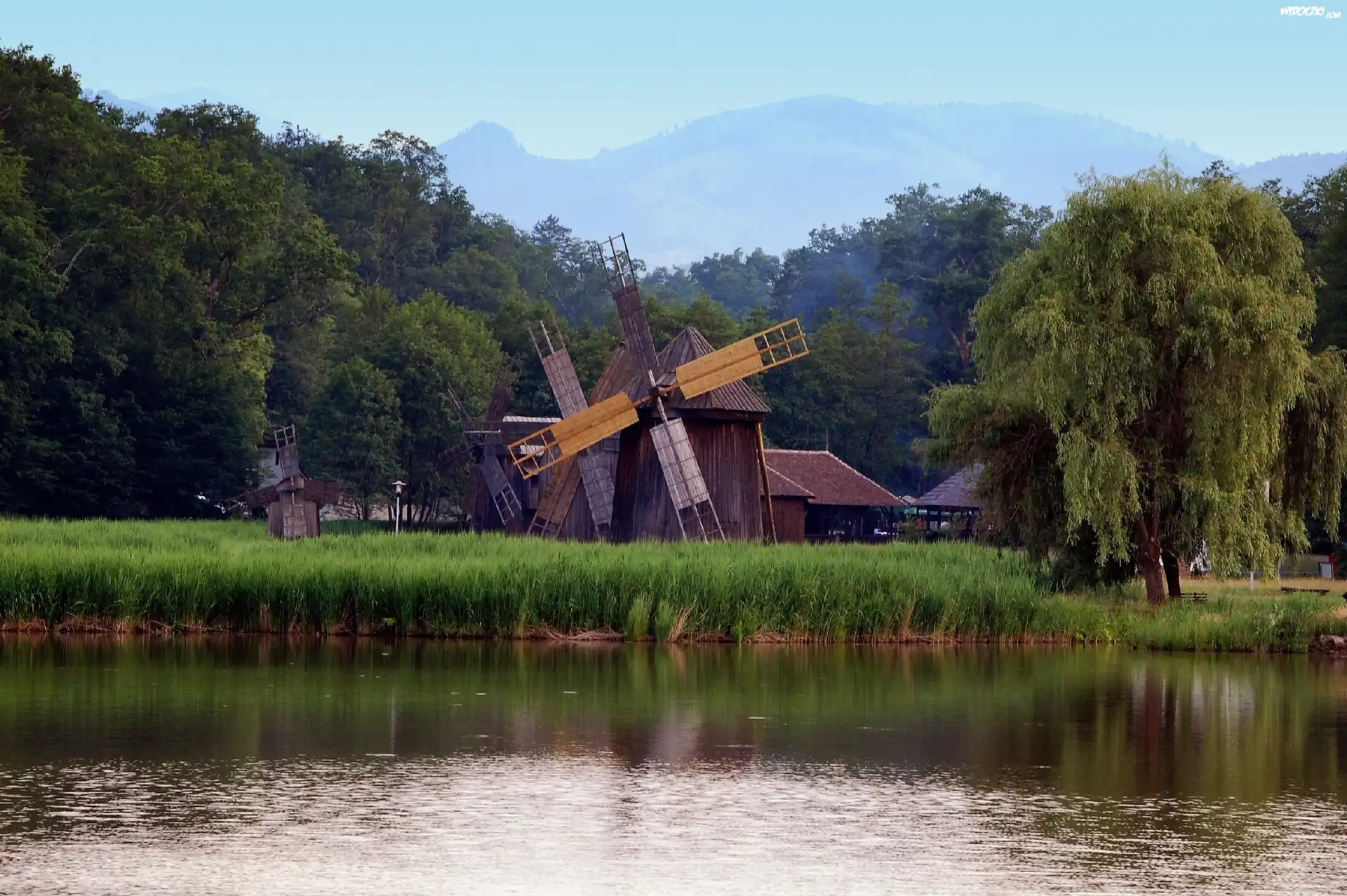 Zdjęcia, Rzeka, Drzewa, Trawy, Wiatraki