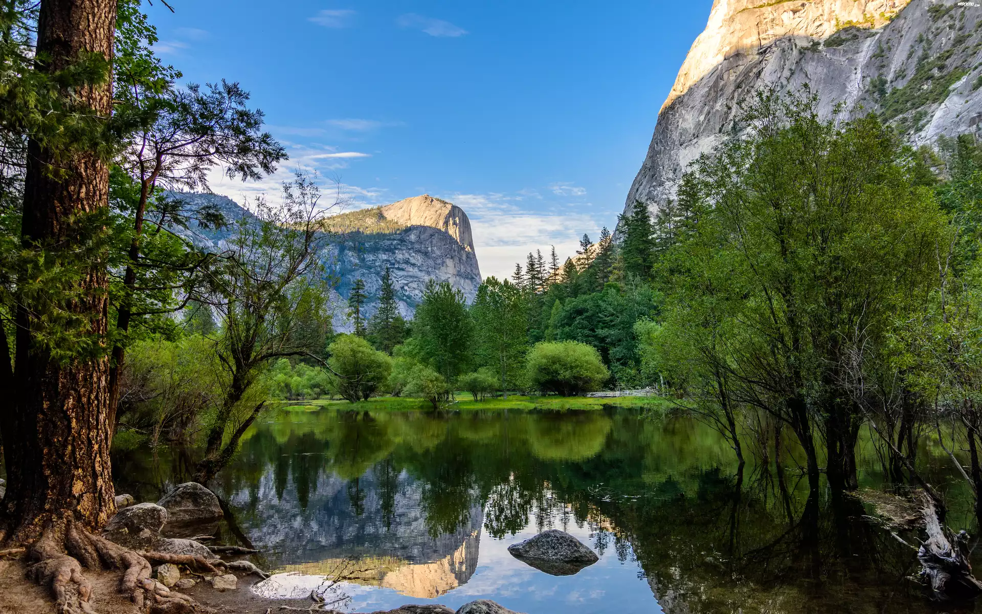 Zdjęcia, Stany Zjednoczone, Stan Kalifornia, Park Narodowy Yosemite, Góry, Rzeka, Drzewa
