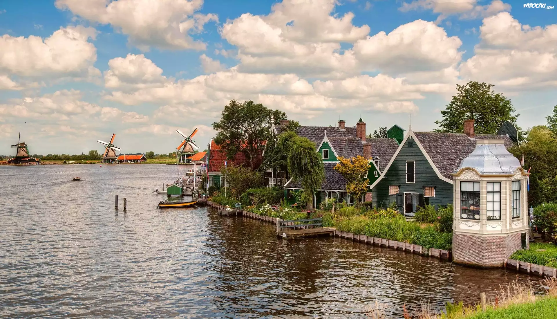 Zdj臋cia, Rzeka, Domy, Wiatraki, Holandia