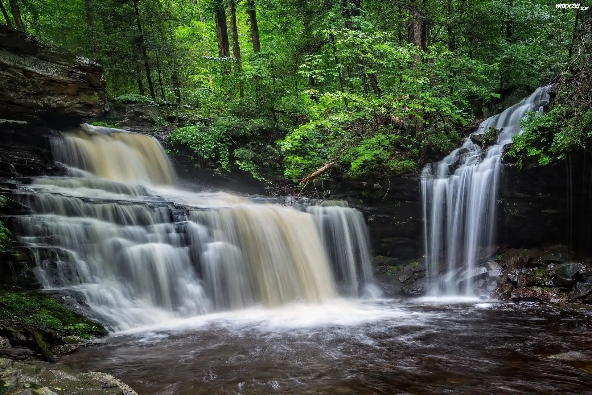 Wodospad Wodospad, łąka Kajakarstwo, Wodospad Wodospad Wodospad w lesie Jezioro, Wodospad, Góry Skała, Wodospad wonski Wodospad Wodospad, Drzewa, Most Wodospad, Lato Liście, Woda, Kaskada Wodospad Wodospad, Wśród, Skał Wodospad Góry, urwisko