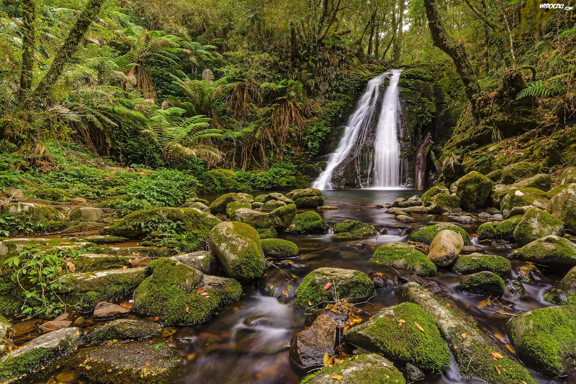 Wodospad, Rzeka, Las, Skały, Omszałe, Kamienie, Roślinność
