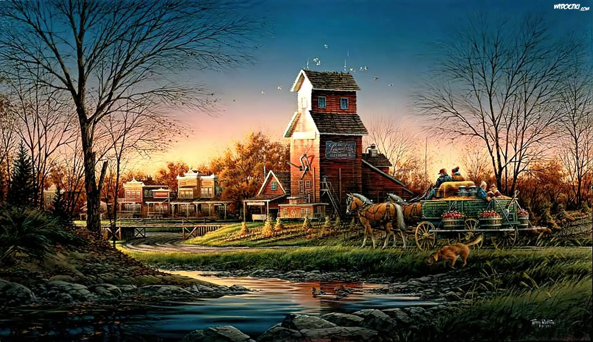 Rzeka, Domy, Wóz, Konny