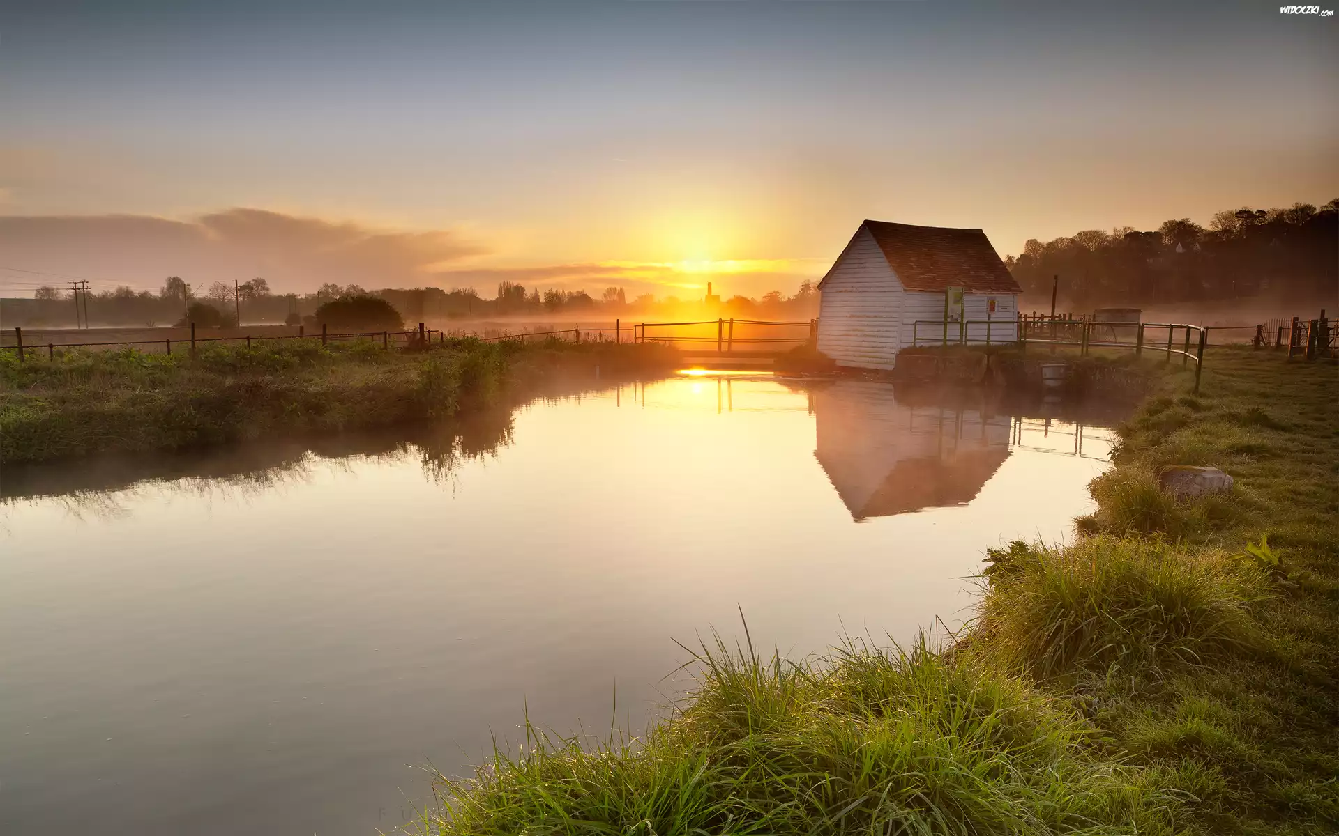 Rzeka, Łąki, Dom, Mgła, Wschód, Słońca