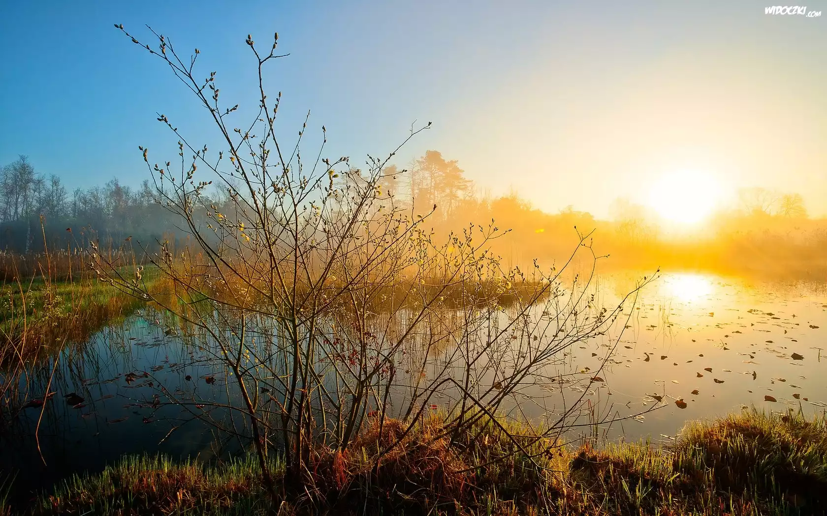 Zdjęcia, Rzeka, Krzewy, Trawy, Wschód, Słońca