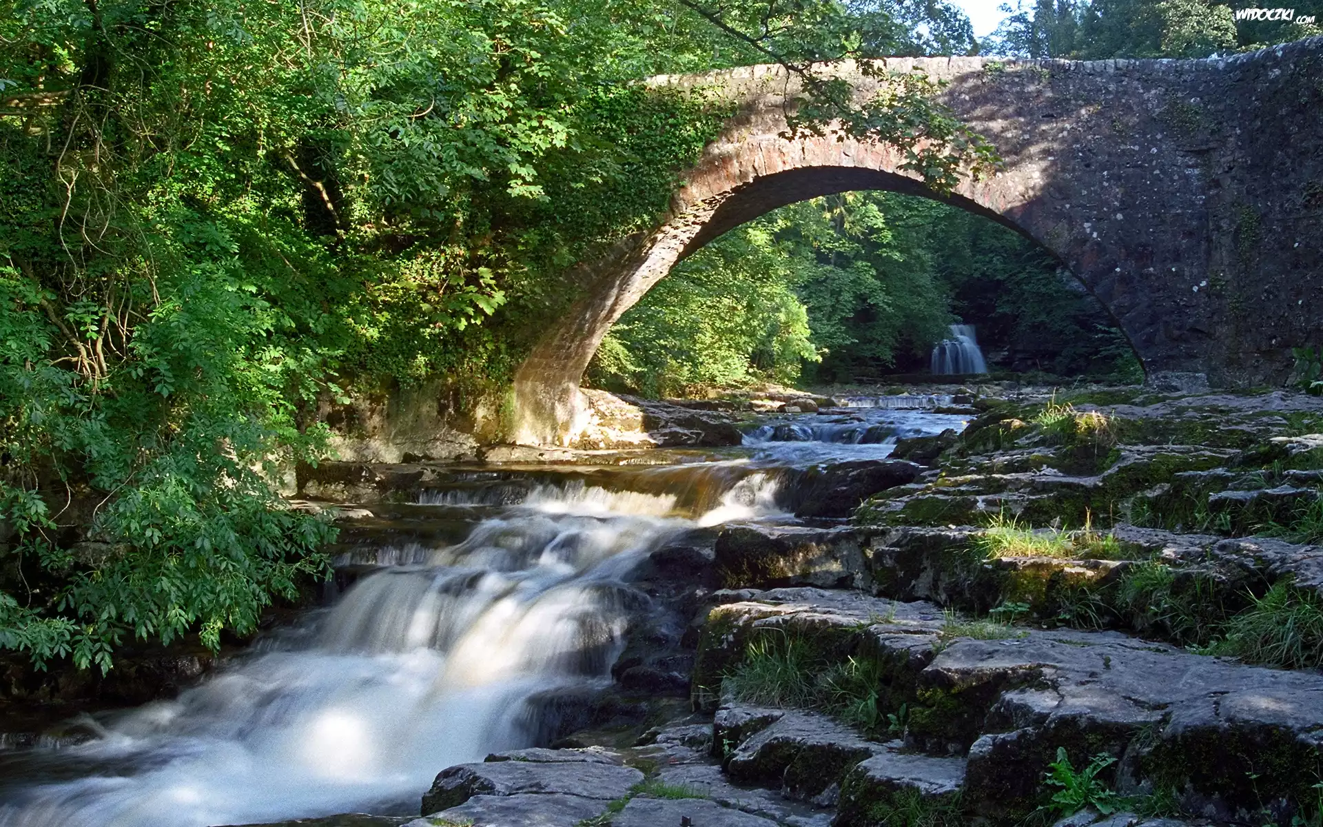 Zdjęcia, Rzeka, Kaskady, Most, Zieleń, Yorkshire, Anglia