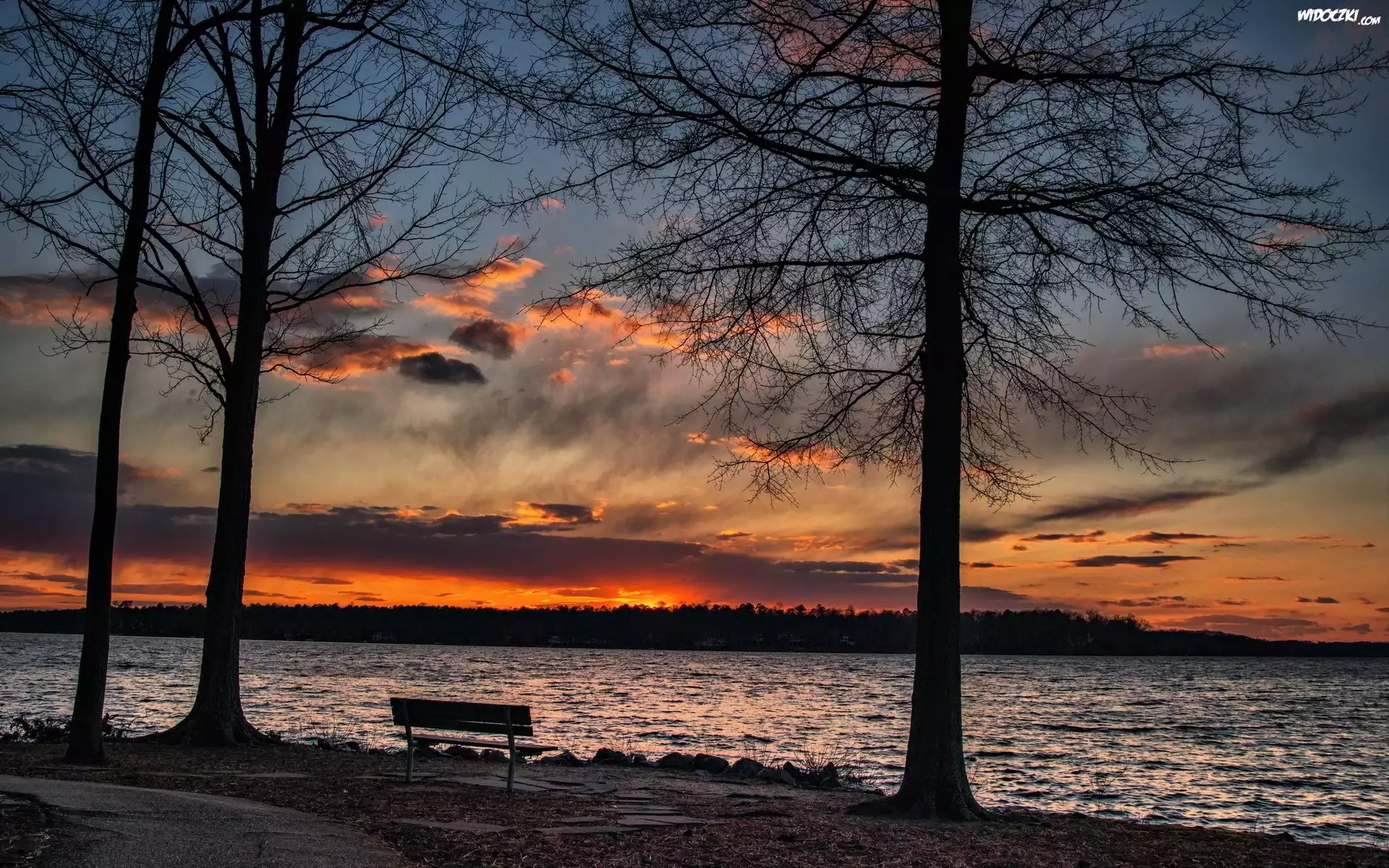 Zdjęcia, Rzeka, Drzewa, Ławka, Zachód, Słońca