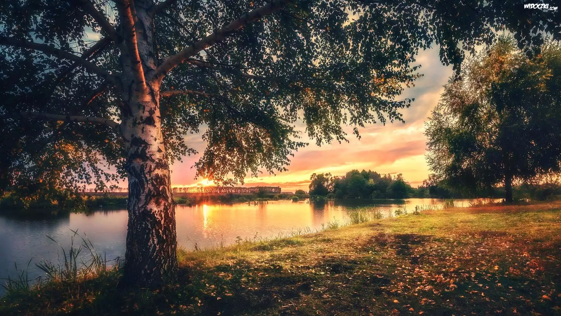 Rzeka, Drzewa, Brzoza, Zachód słońca