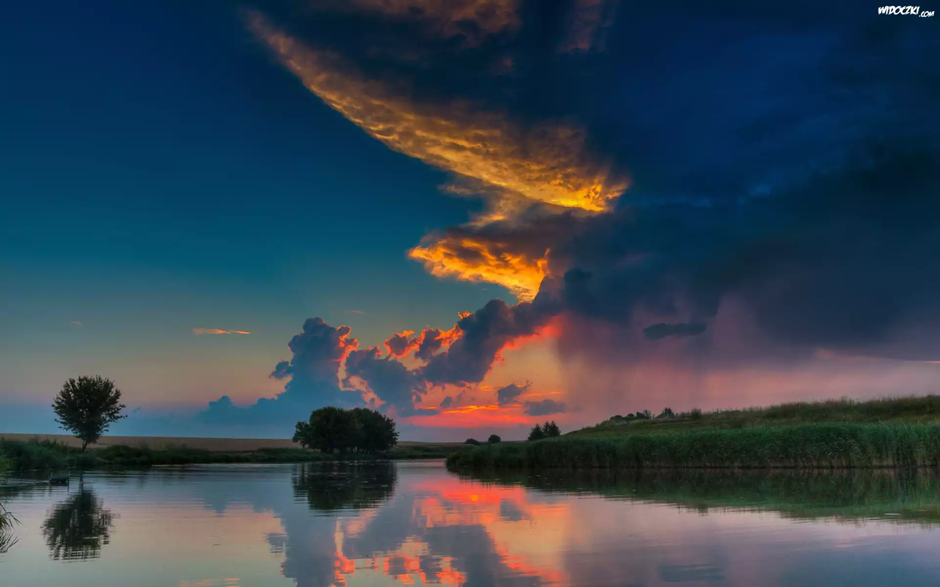 Zdjęcia, Rzeka, Drzewa, Chmury, Zachód, Słońca
