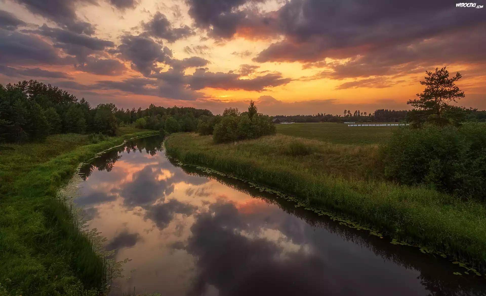 Rzeka, Drzewa, Chmury, Odbicie, Zachód słońca