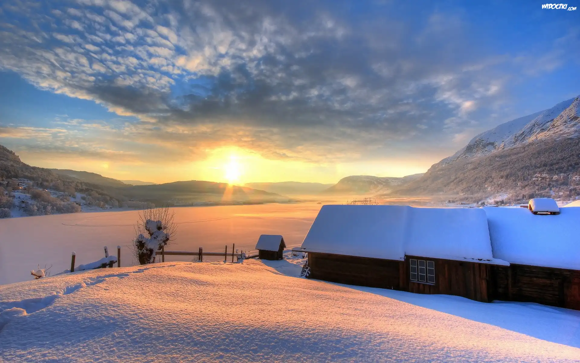 Zdjęcia, Rzeka, Góry, Domy, Zachód, Słońca