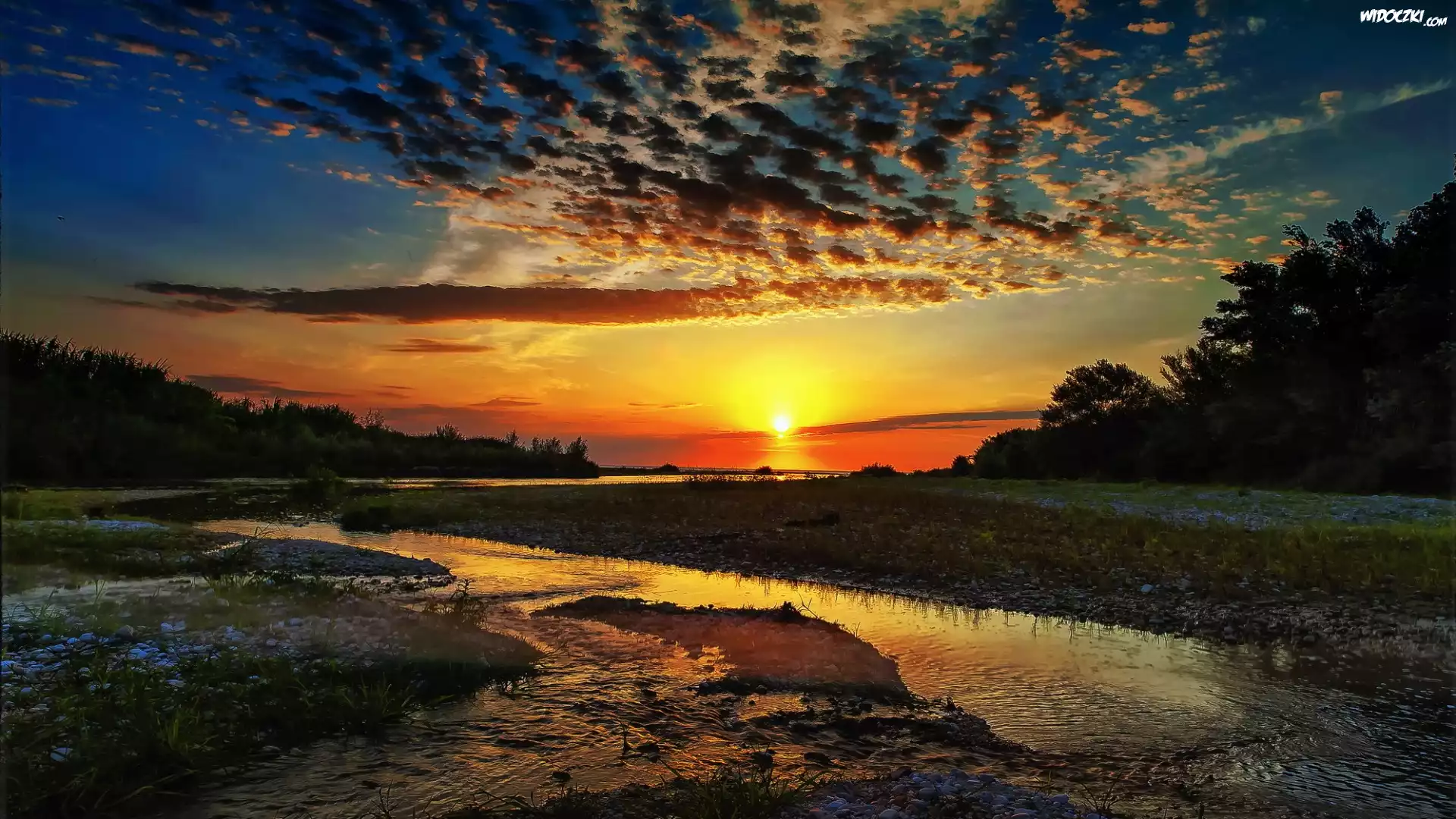Zdjęcia, Rzeka, Kamienie, Lasy, Chmury, Zachód, Słońca