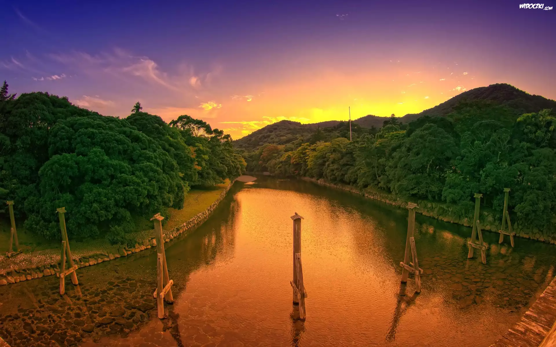 Rzeka, Drzewa, Niebo, Zachód, Słońca