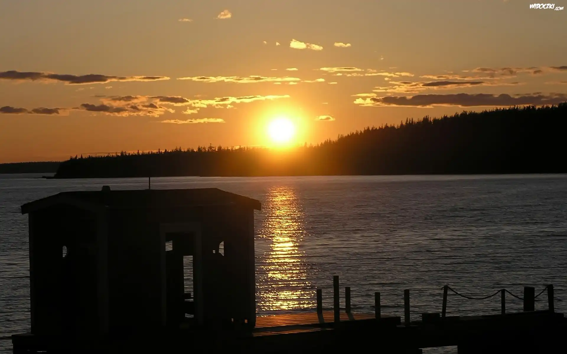 Zdjęcia, Rzeka, Las, Pomost, Zachód, Słońca