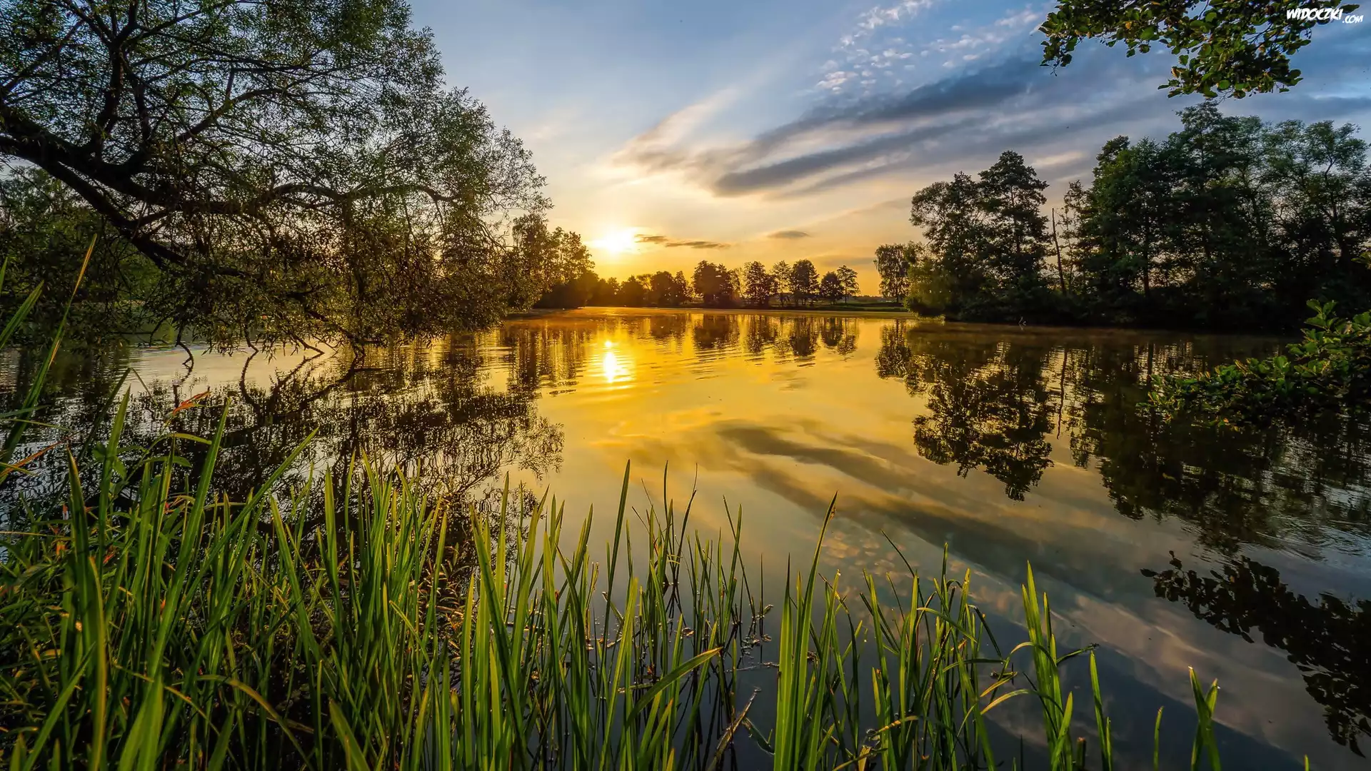 Rzeka, Drzewa, Trawy, Zachód, Słońca