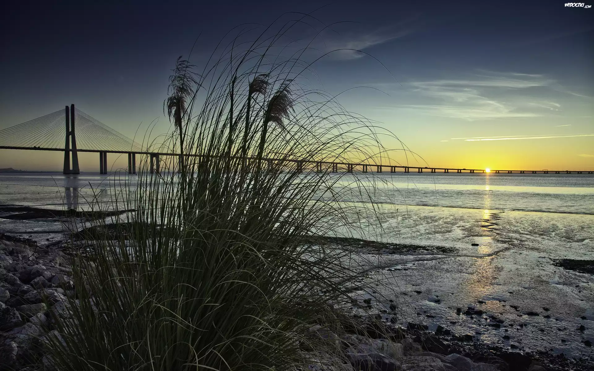 Zdjęcia, Rzeka, Most, Trawy, Kamienie, Zachód, Słońca