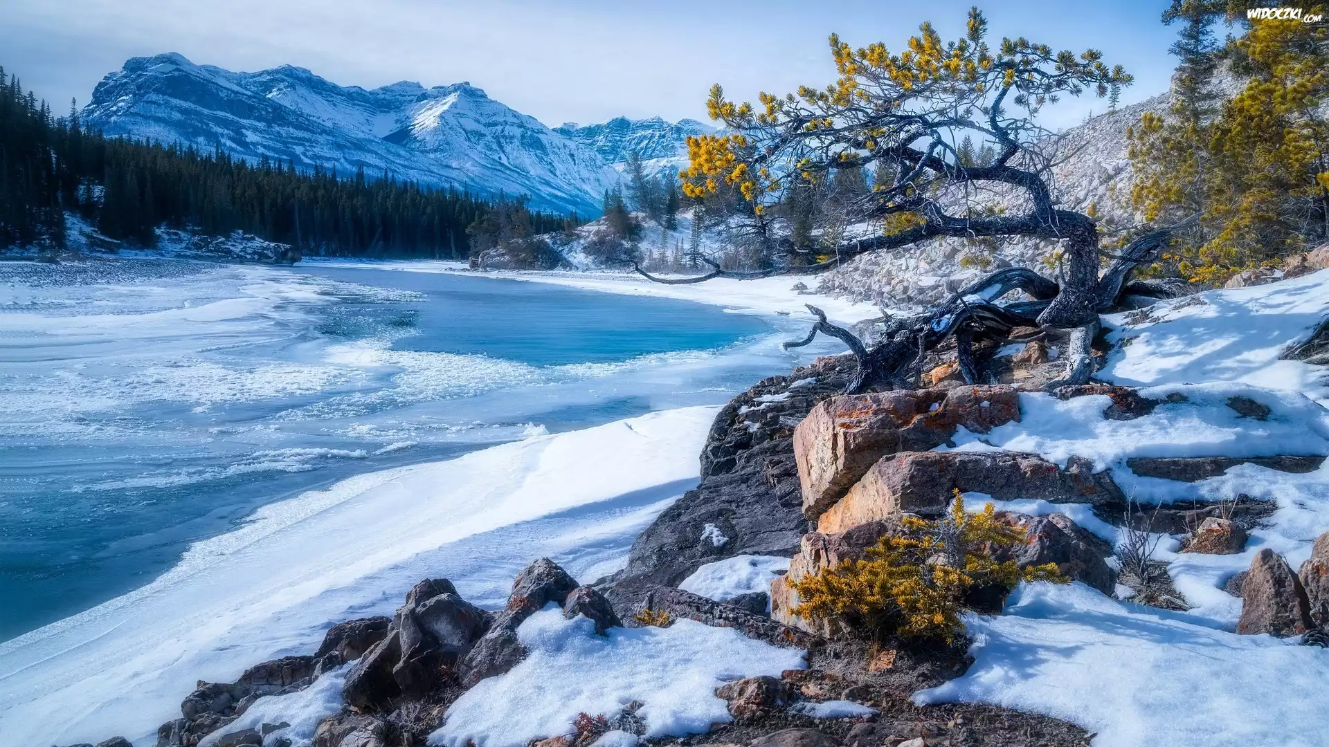 Zima, Góry, Zaśnieżona, Rzeka, Skały, Drzewa, Sosny