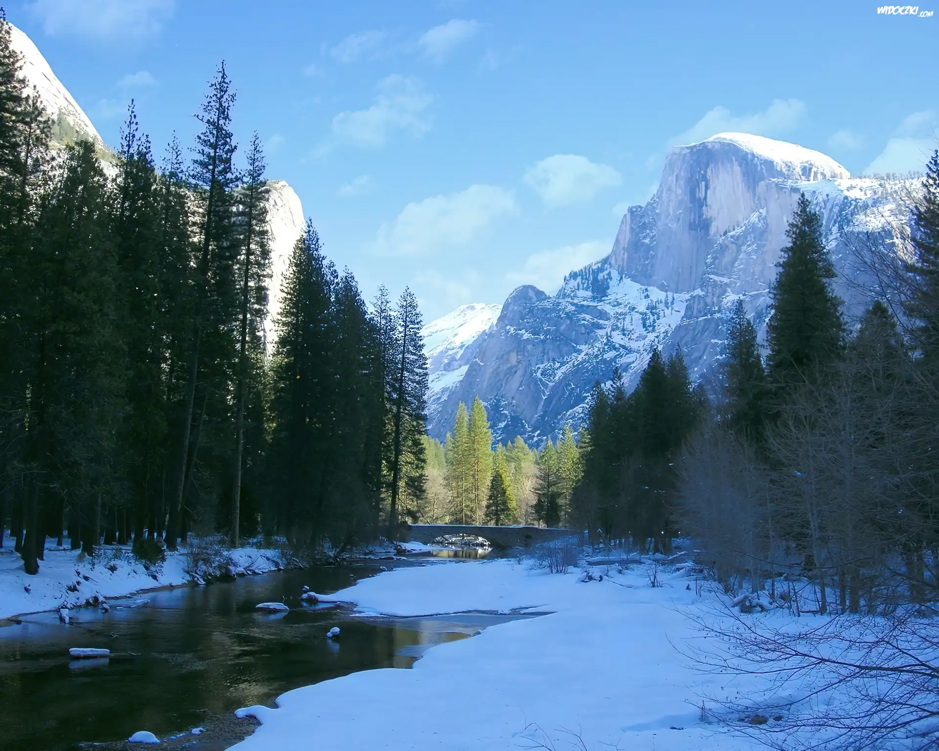 Rzeka, Zalesione, Brzegi, Góry, Zima, Yosemite