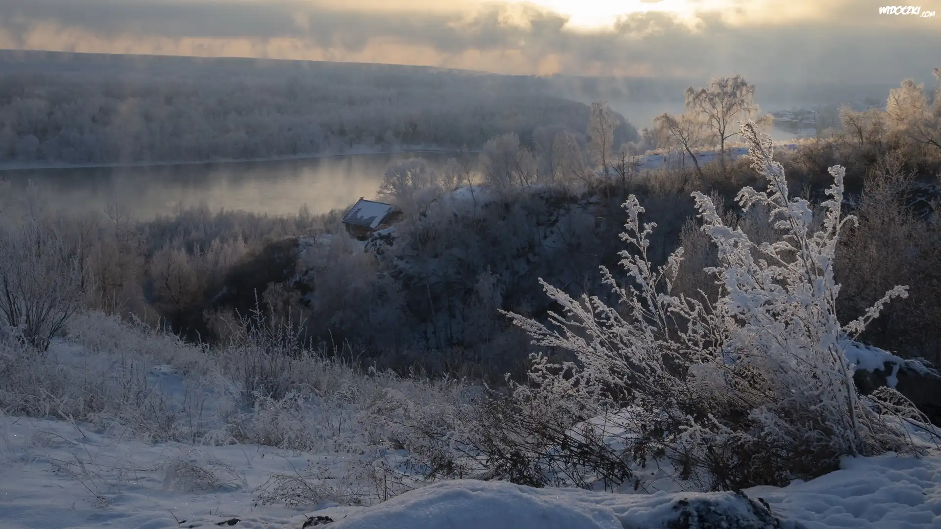 Zdjęcia, Zima, Rzeka, Oszronione, Krzewy, Drzewa, Wzgórze, Dom
