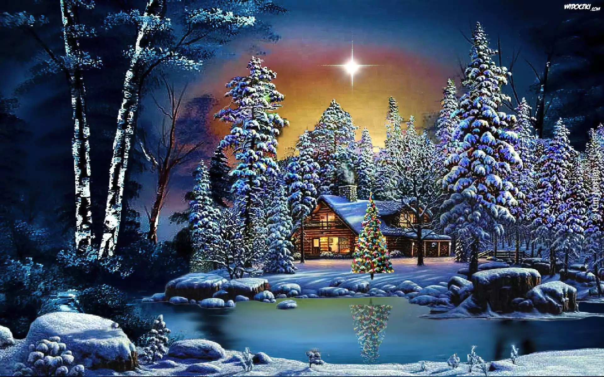 Zdjęcia, Rzeka, Drzewa, Domek, Zima, Święta