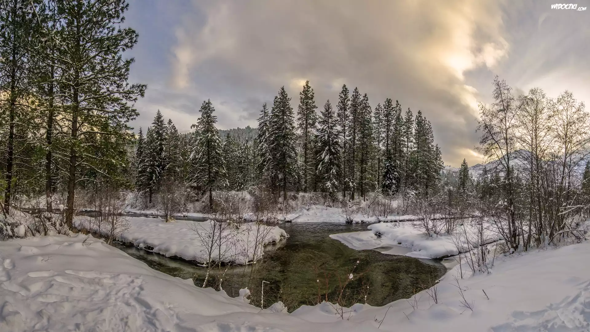Zima, Rzeka, Góry, Drzewa, Chmury, Wschód słońca