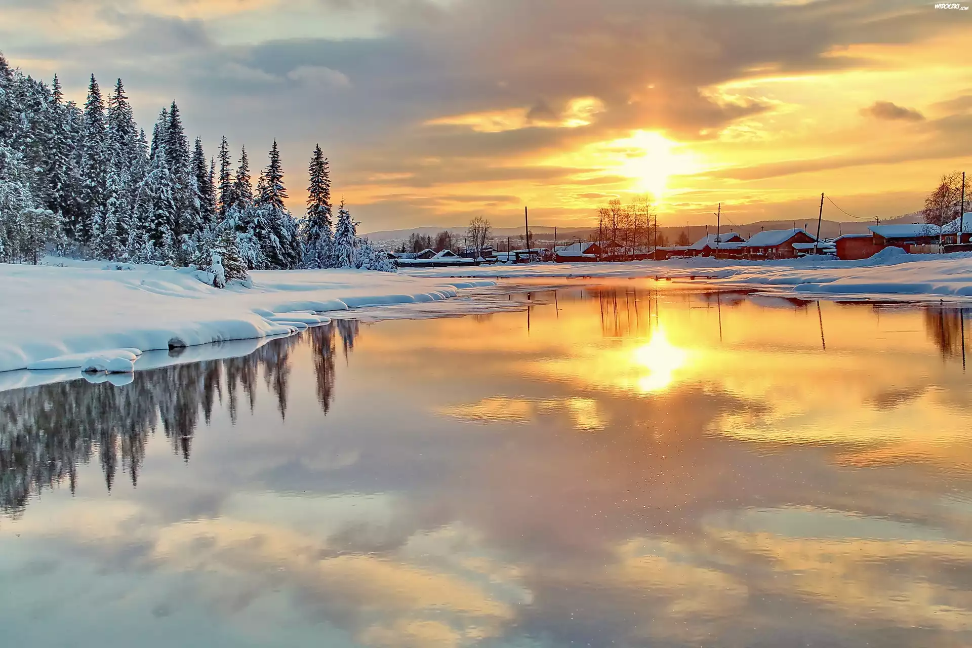 Zima, Rzeka, Ośnieżone, Drzewa, Domy, Zachód, Słońca