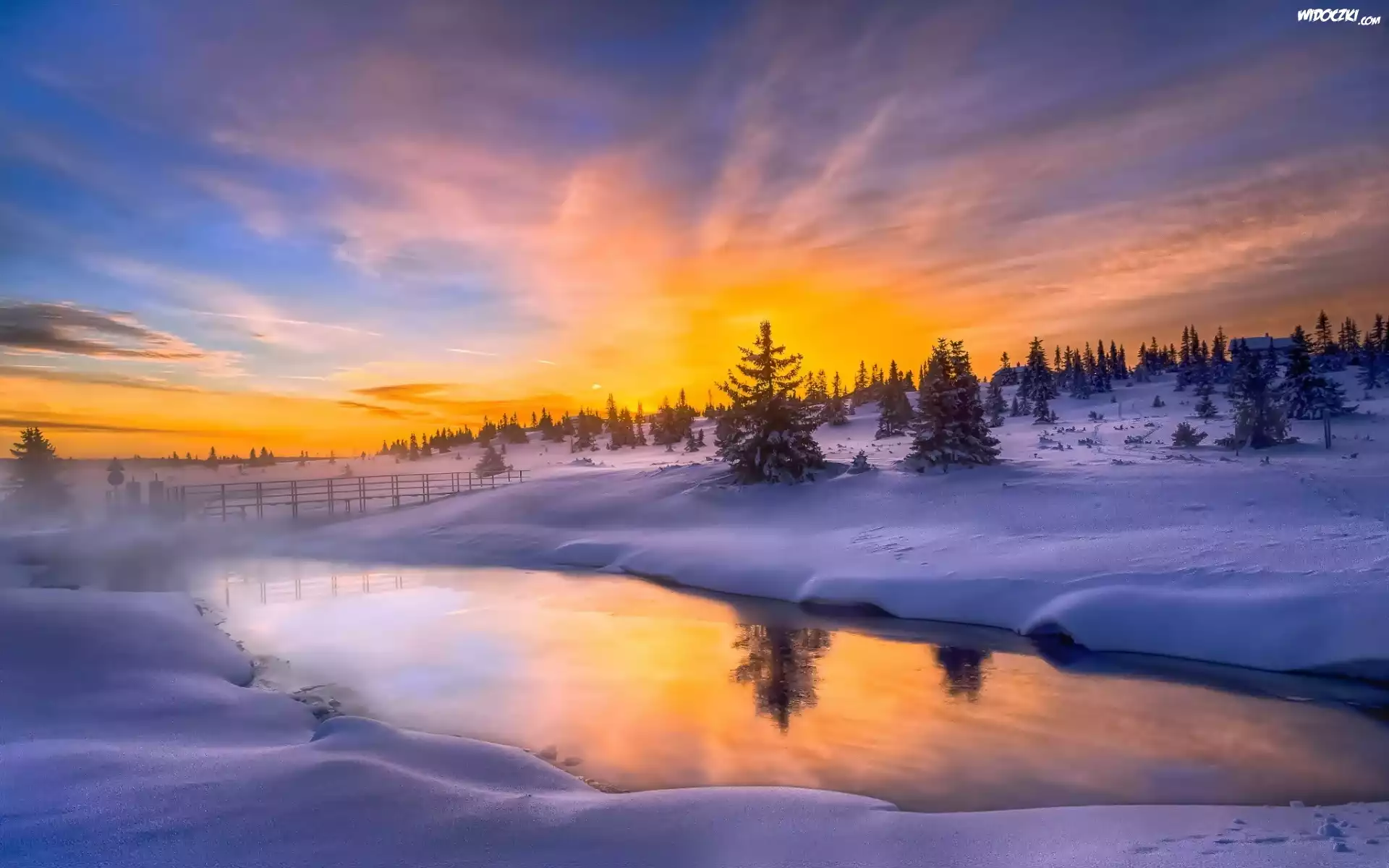 Zdjęcia, Zamarznięta, Rzeka, Mostek, Zachód, Słońca, Las, Domy, Zima