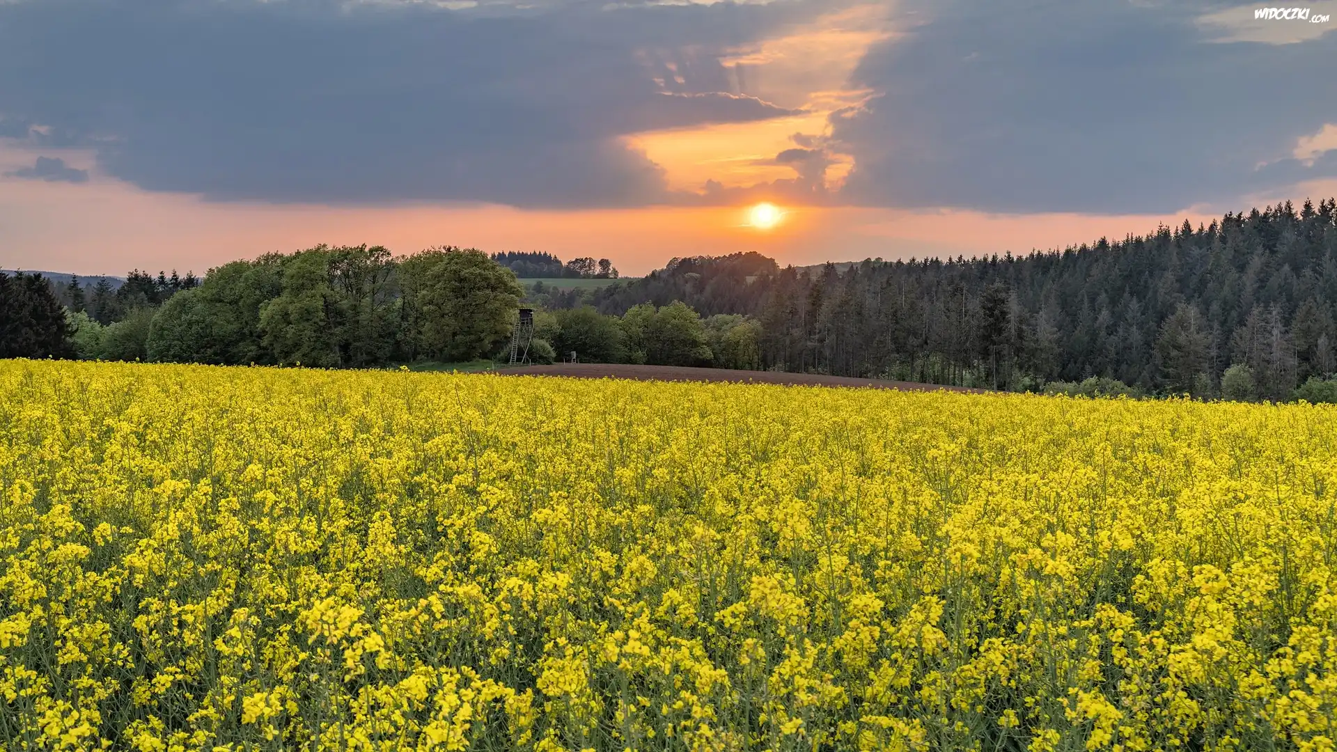 Zdjęcia, Las, Drzewa, Pole, Rzepak, Zachód słońca