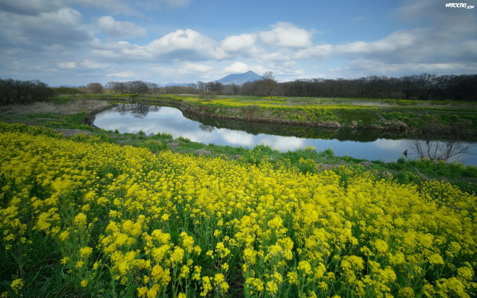 Pole, Rzepak, Rzeka, Polana, Drzewa, Roślinność, Góry, Wiosna