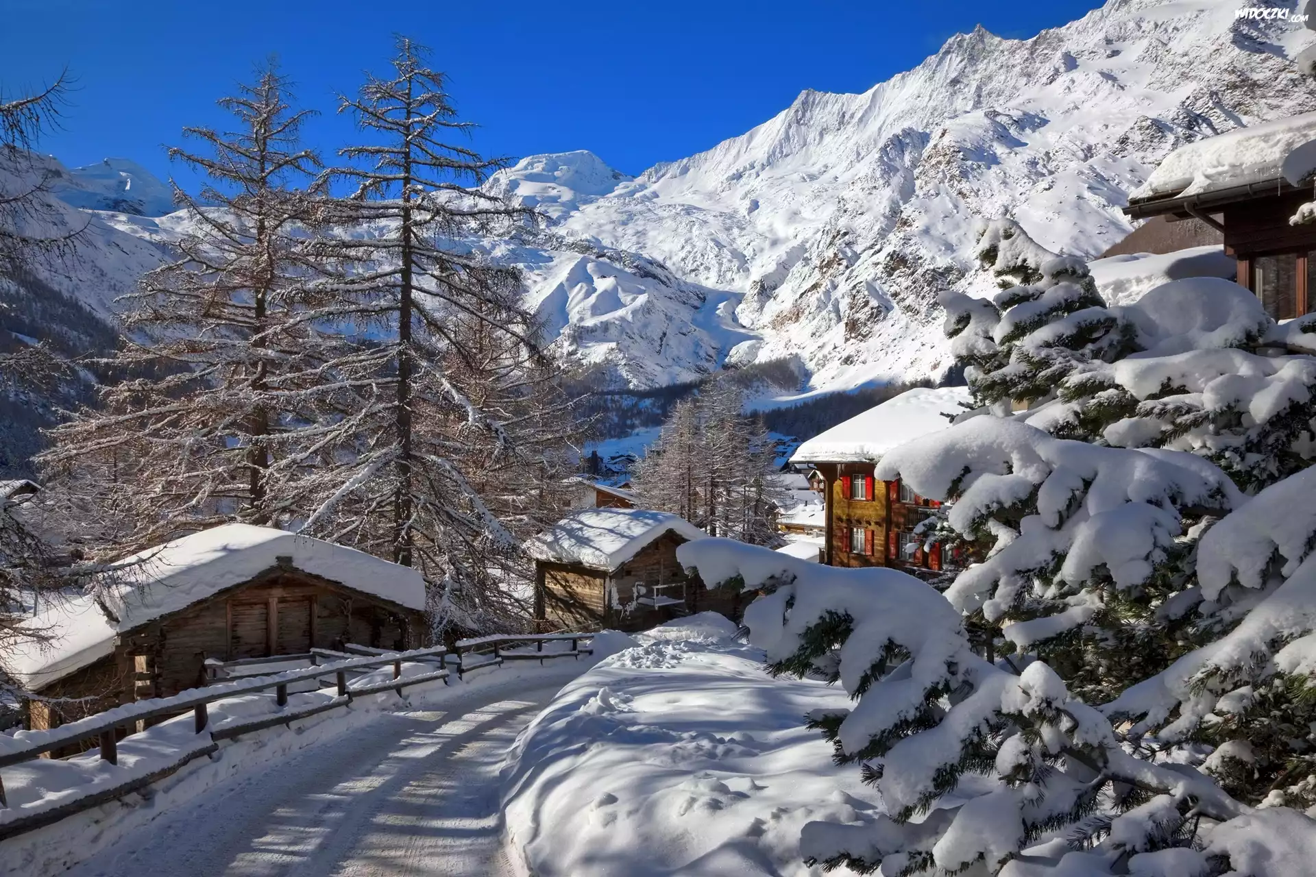 Szwajcaria, Saas-Fee, Zima, Góry, Wieś, Domy, Droga
