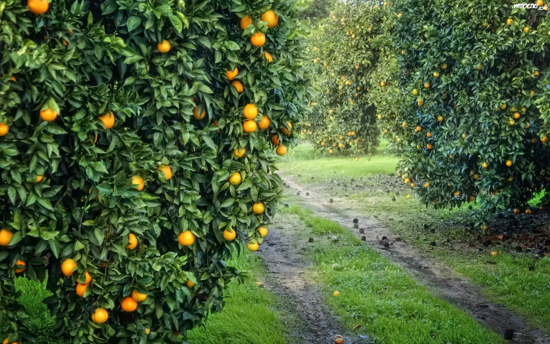 Zdjęcia, Sad, Drzewa, Pomarańcze, Ścieżka, Trawa