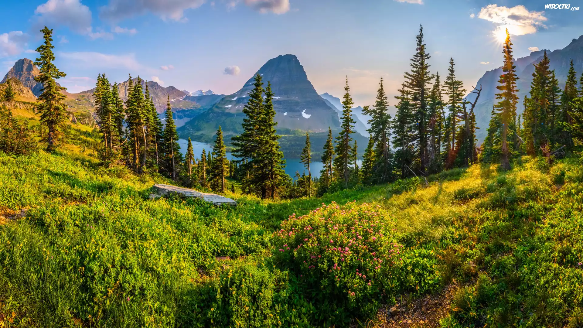 Stany Zjednoczone, Montana, Park Narodowy Glacier, Góry, Jezioro, Saint Mary Lake, Drzewa, Krzewy, Trawa |