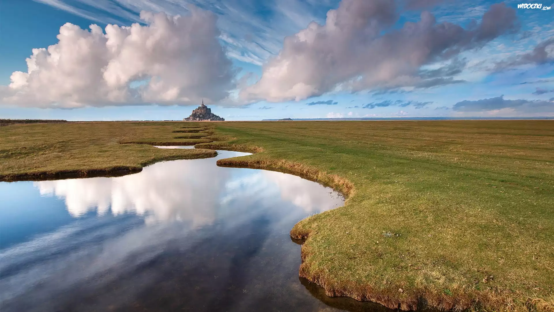 Francja, Mont Saint Michel, Opactwo św Michała Archanioła, Chmury, Woda, Łąka