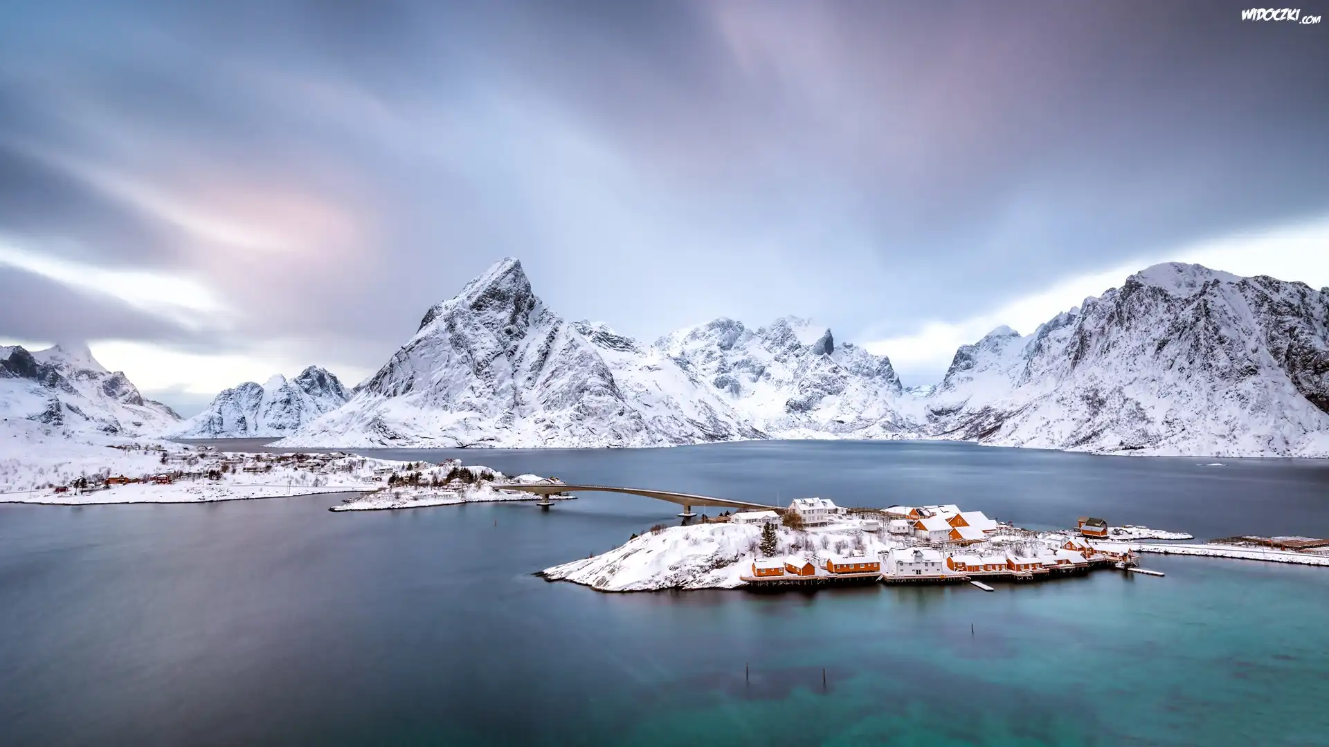 Zdjęcia, Norwegia, Morze, Lofoty, Zima, Góry, Mount Olstind, Mgła, Wioska Sakrisoy