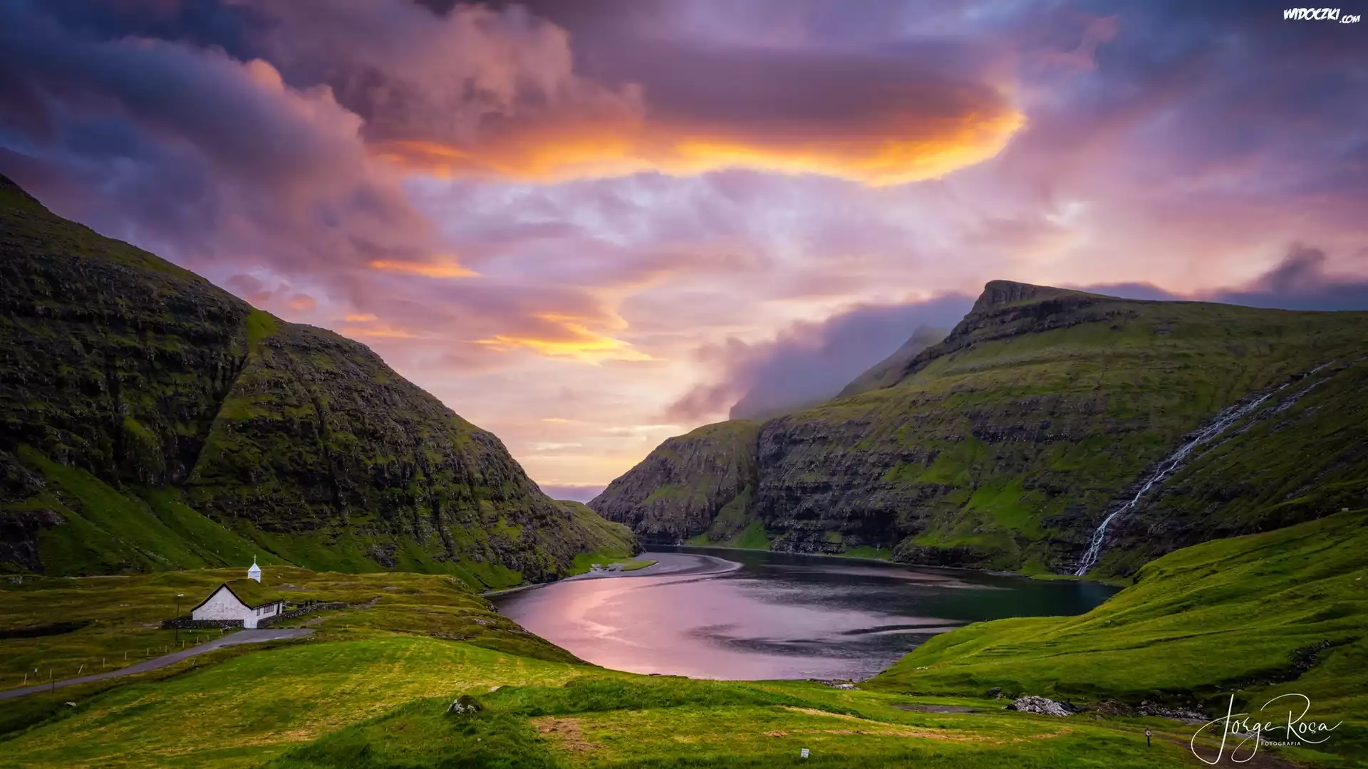 Zdjęcia, Góry, Jezioro, Kościół, Droga, Laguna Pollurin, Saksun, Chmury, Wyspy Owcze, Dania