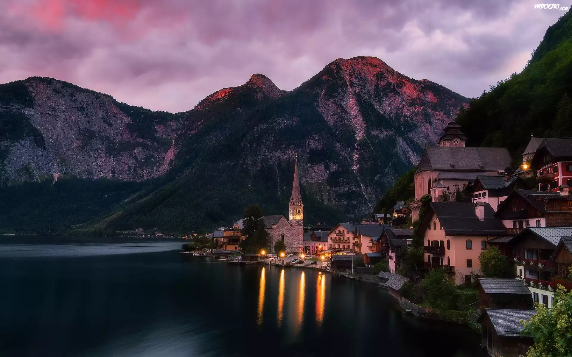 Zdjęcia, Austria, Salzkammergut, Hallstatt, Kościół, Jezioro Hallstattersee, Domy, Góry
