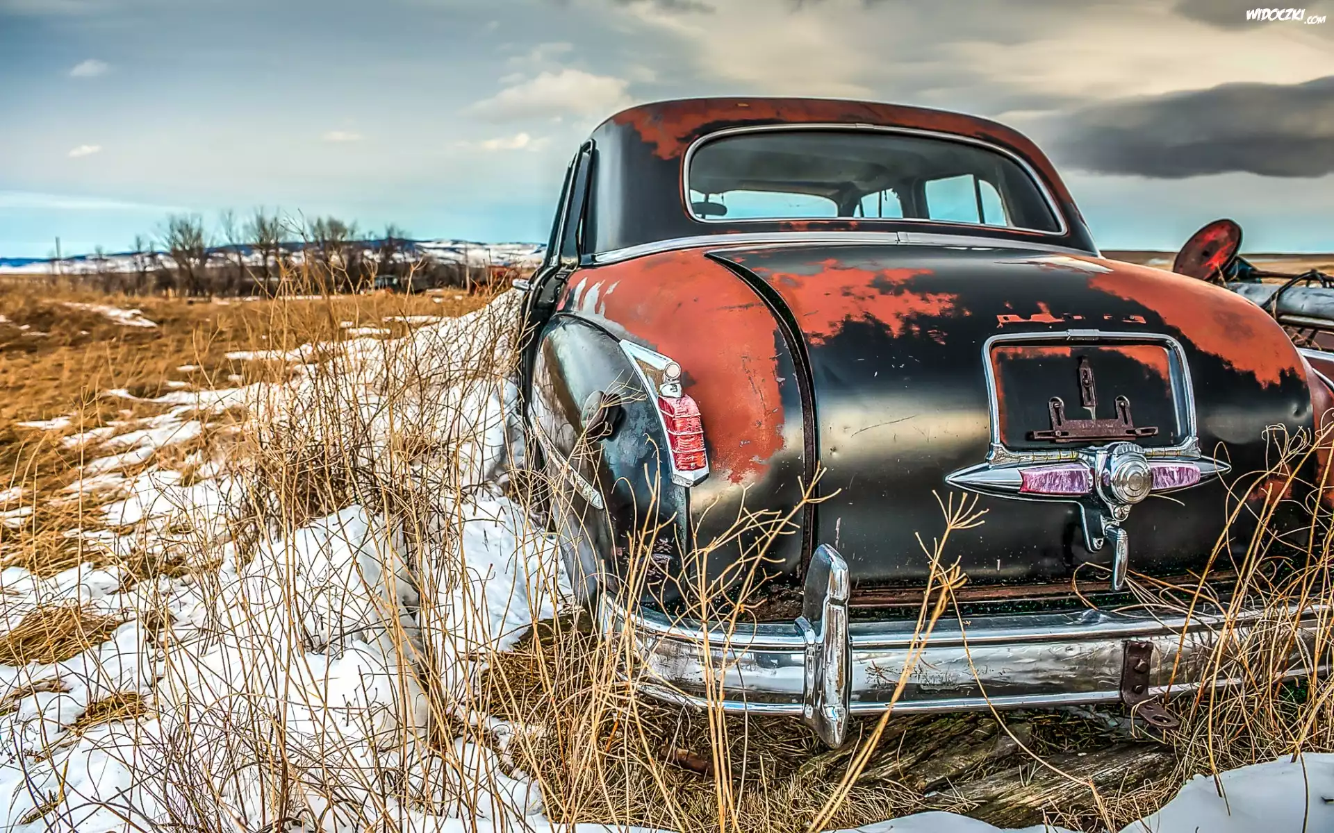 Samochód, Wrak, Rdza, Łąki, Trawa, Śnieg